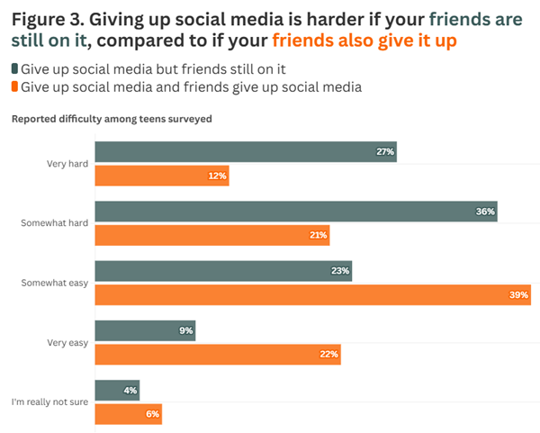 We also asked respondents how they would feel about giving up social media. First, they were asked how they would find it if they had to give up social media today while their friends continued to use it. Then they were asked how they would feel if they had to give it up and all their friends had to as well. We found that the proportion of teens who said it would be easy to give up social media almost doubled when their friends also had to give it up (61%) compared with when they had to give it up alone (32%).