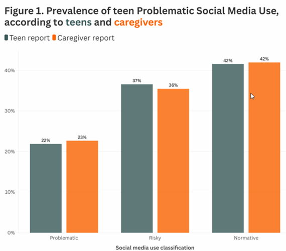 Concerningly, 22% of teens in our teen survey met the criteria for problematic social media use. Among girls, the figure was one in four. Over a third fell into the “risky” category, leaving only 42% of young people whose use could be considered “normative.”